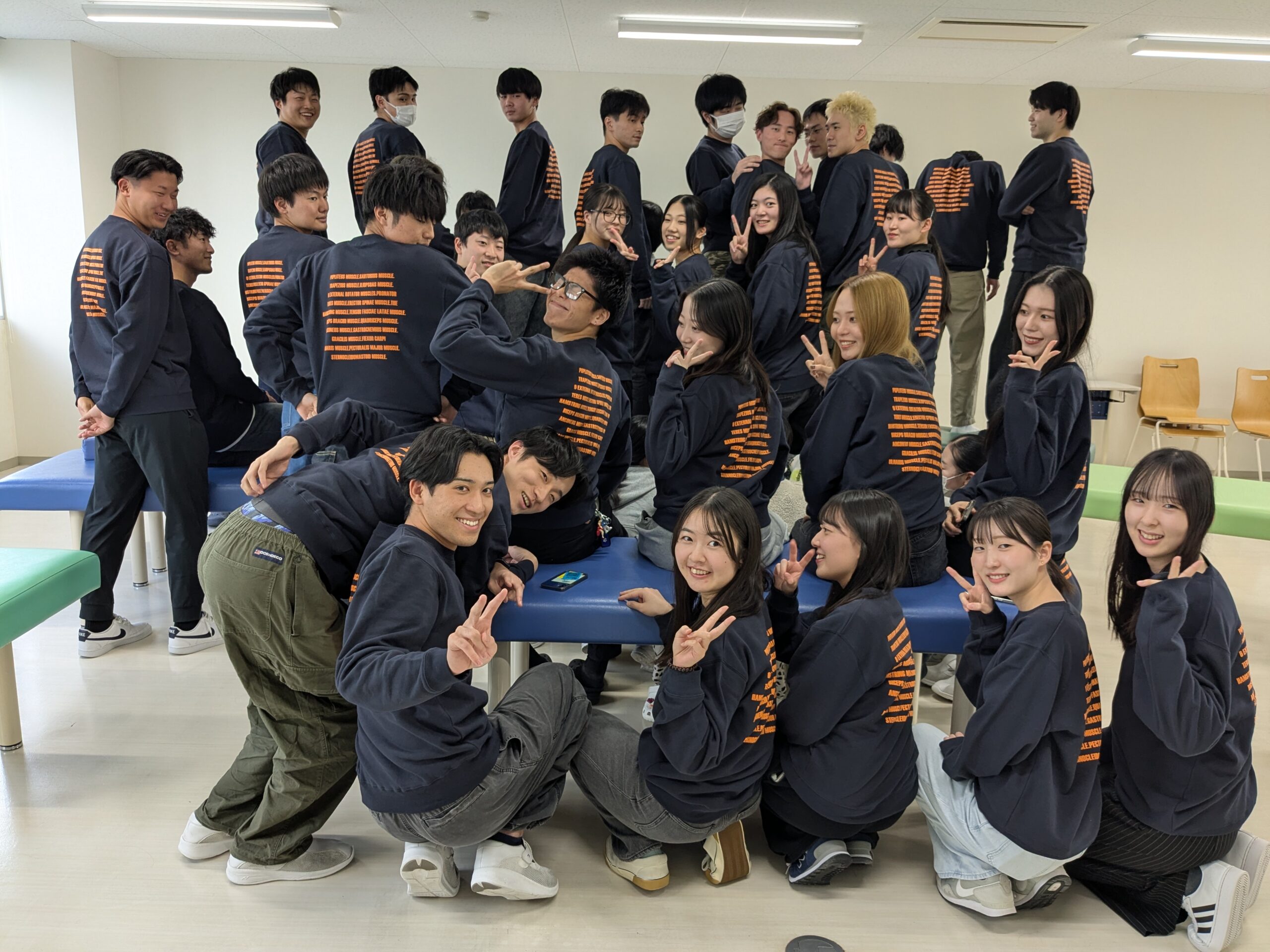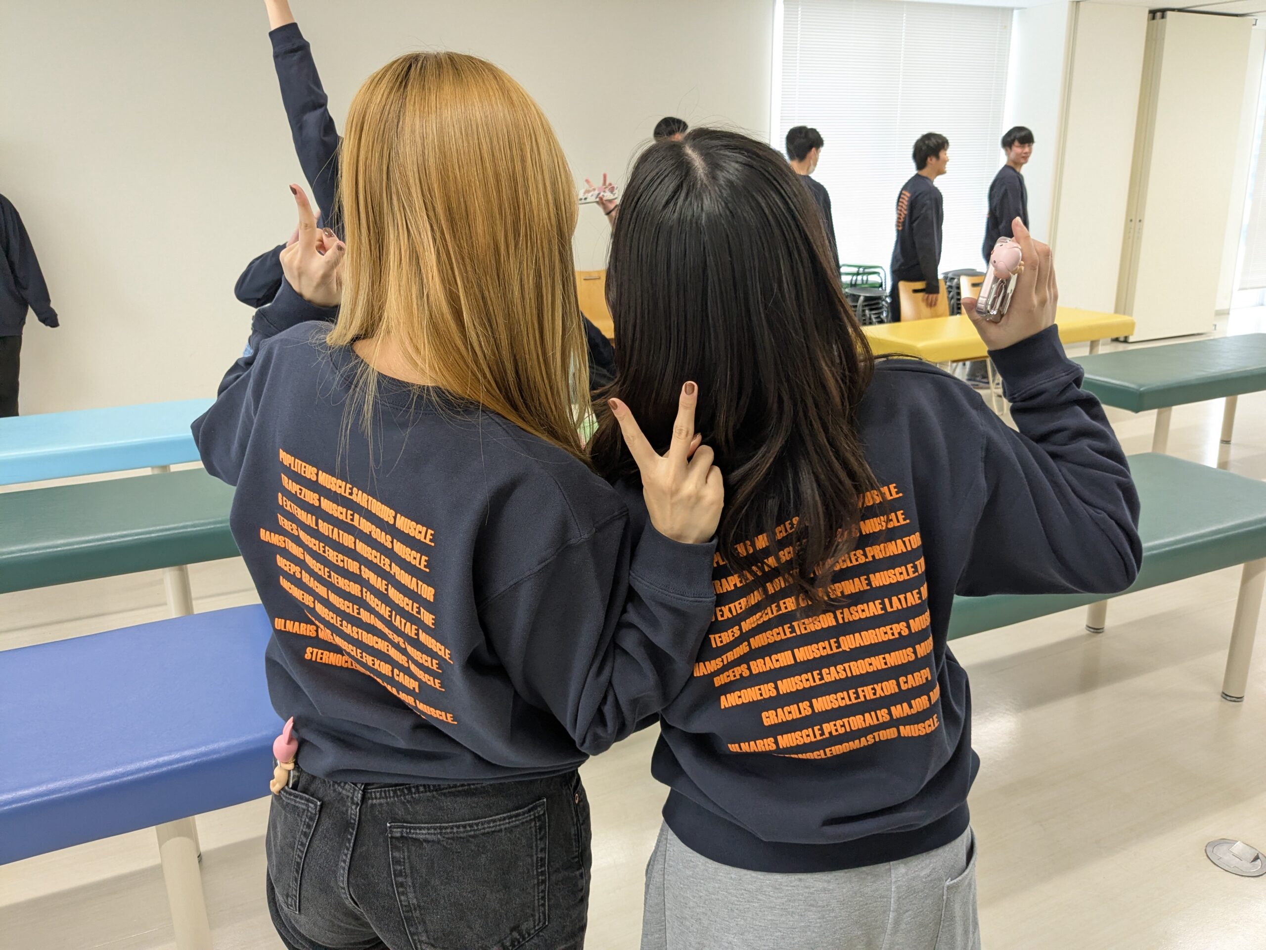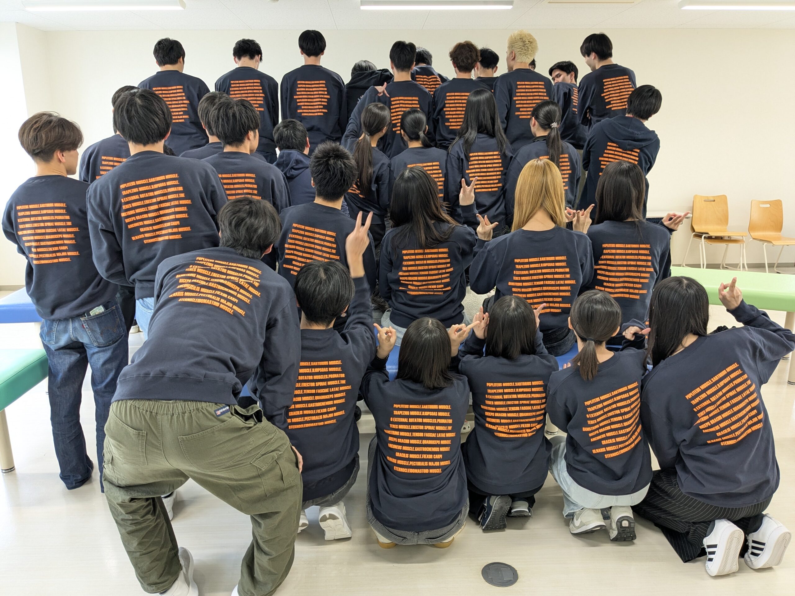 背中には筋肉の名前がずらり——理学療法科らしさ満点の仕上がりです。