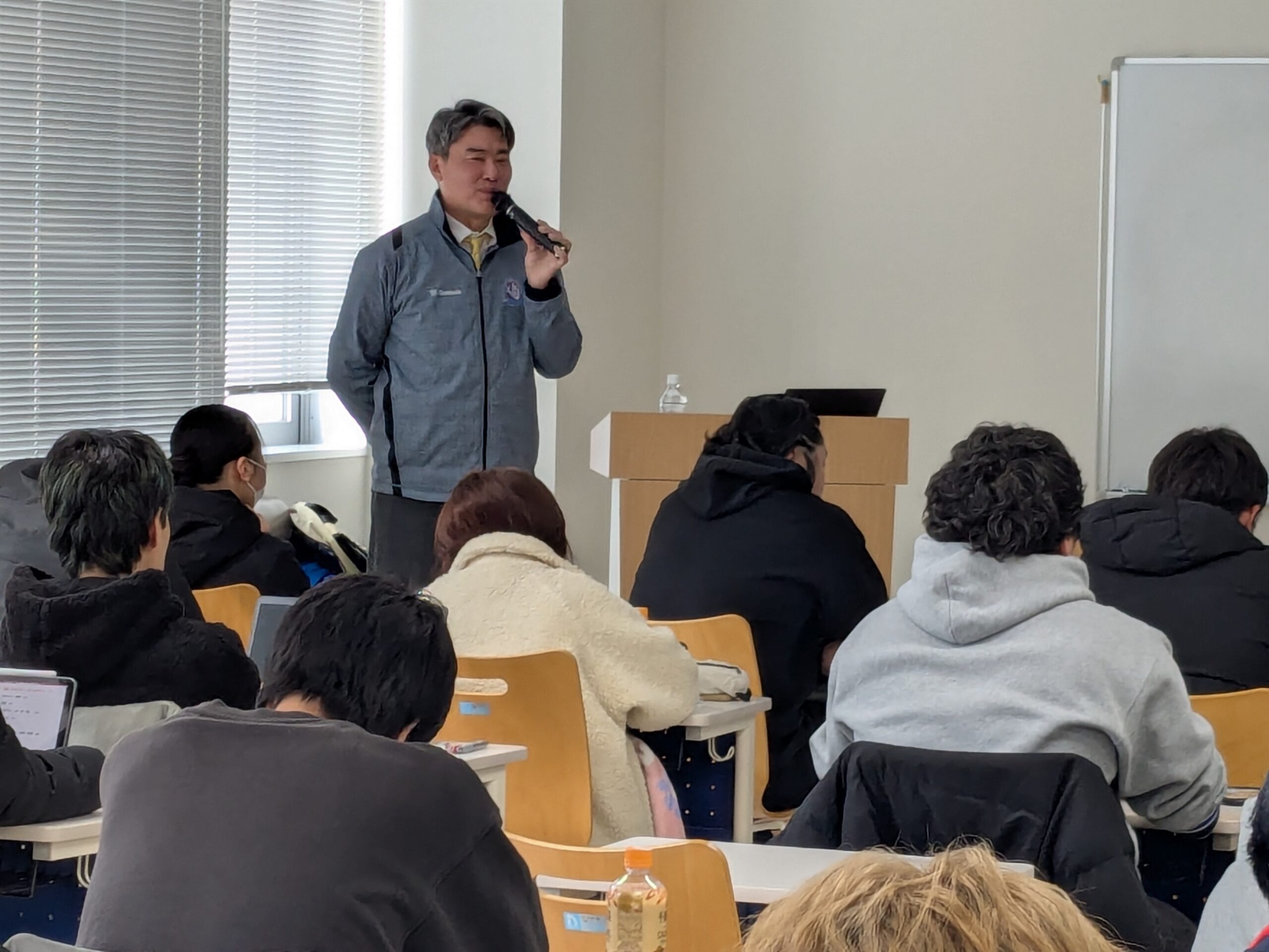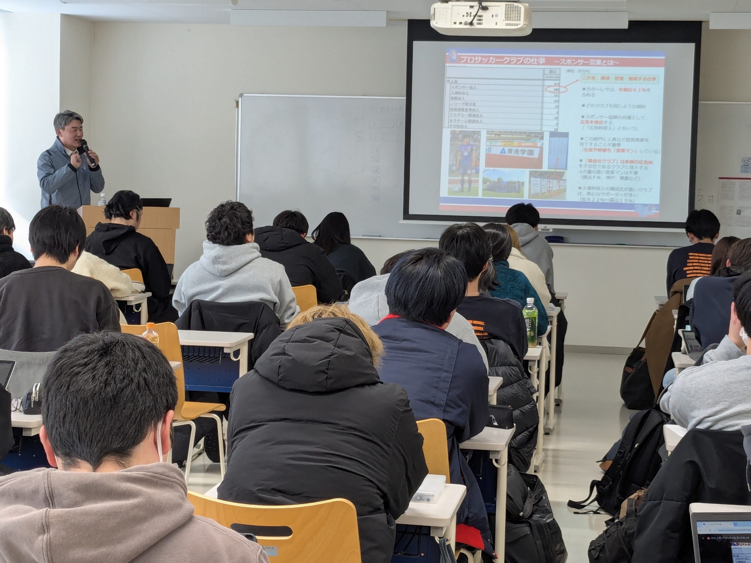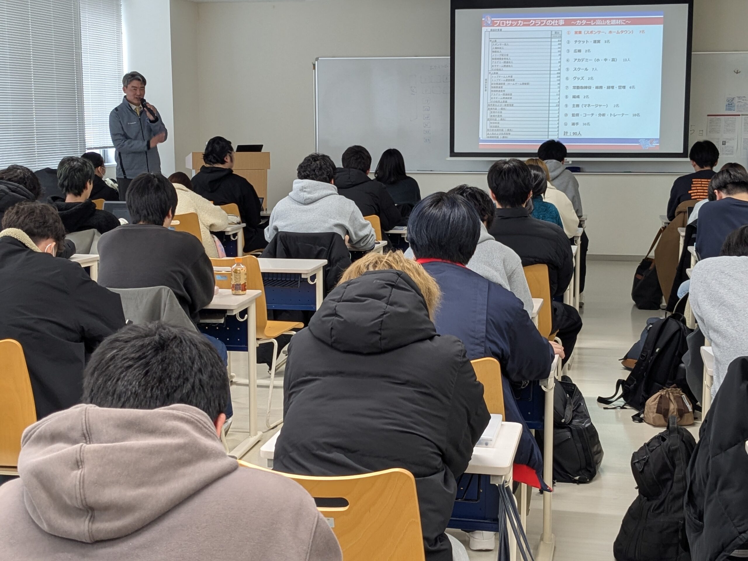 先日、本校では、プロサッカークラブ「カターレ富山」の営業部長・野上範允さんをお招きし、特別授業「スポーツビジネス講義」を行いました。
