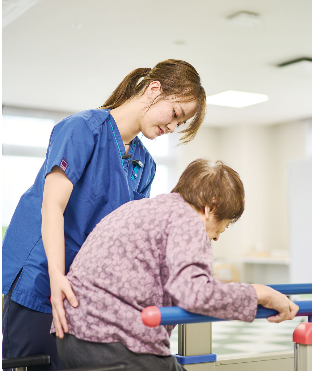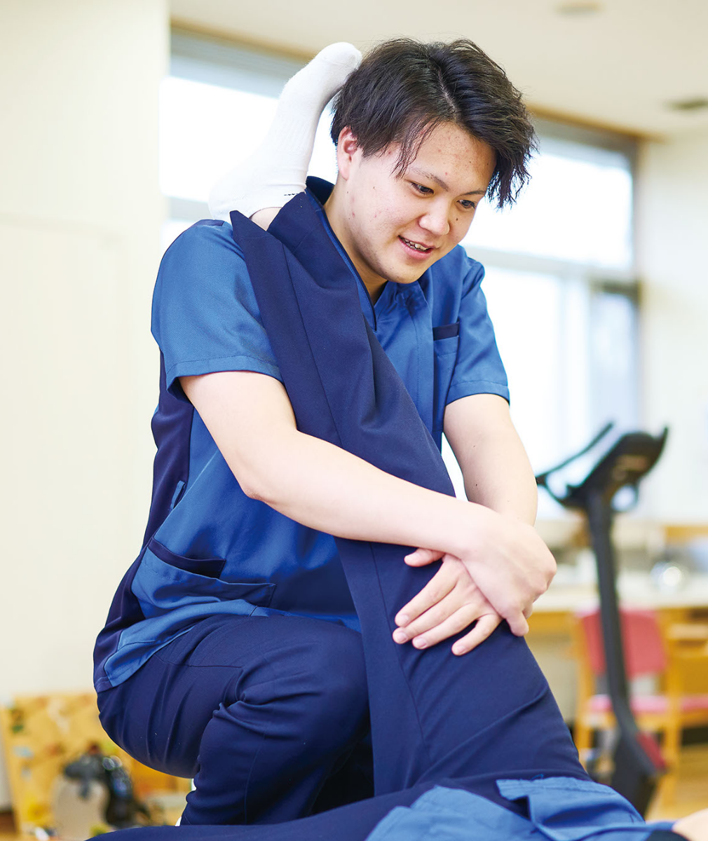 理学療法士として、施設での個別・集団リハビリや介護の面で、食事や排せつなど生活面でのサポートを行っています。