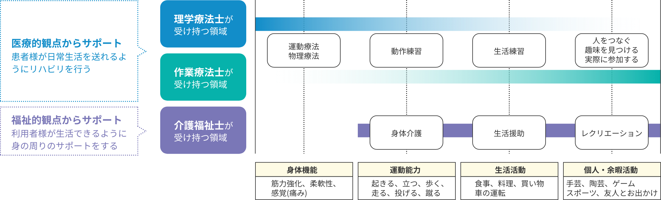 理学療法士、作業療法士、介護福祉士の仕事領域は、それぞれ重なり合っています。医療・福祉それぞれの視点から患者様の生活や健康管理のサポートを行います。